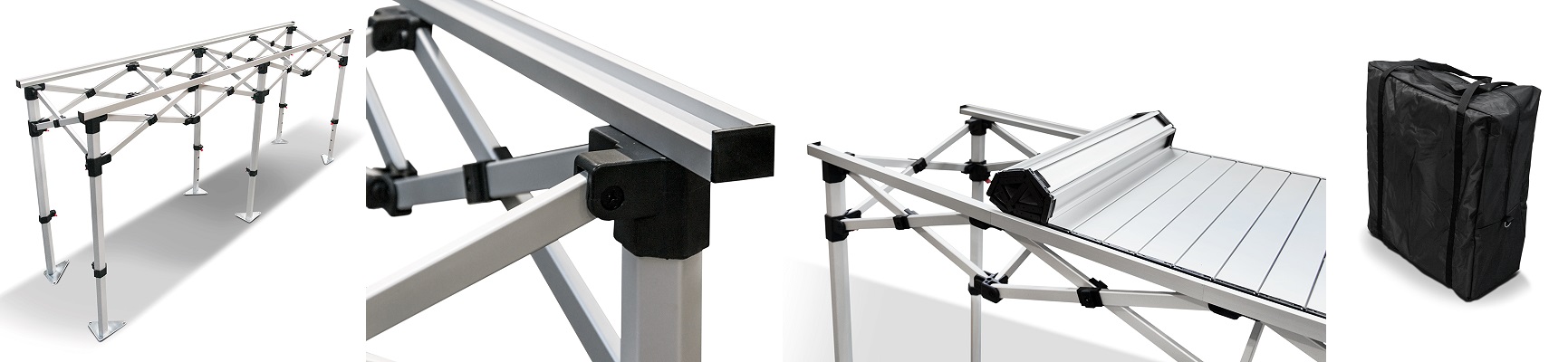 De tafel is zeer eenvoudig op te vouwen. De tafelconstructie is een eenvoudige pop-upoplossing, waardoor u de tafel snel kunt vastzetten. U kunt ook de hoogte van de tafel aanpassen (68,5 - 74 - 81,5 - 90 - 97,5 cm). Het tafelblad is volledig oprolbaar, waardoor het zeer eenvoudig op te zetten is en compact is. Beschikbaar in 3 afmetingen . Gewicht 24,5 kg. Ook verkrijgbaar met bedrukte cover.| Aantal | Prijs per stuk |