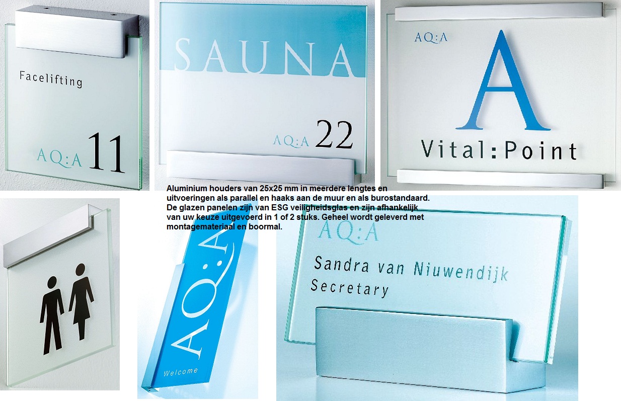 Een opvallend, flexibel en compleet systeem waarbij de dubbele glaspanelen van 3 mm ESG veiligheidsglas schuin geplaatst zijn in een aluminium houder van 2,4x2,4 cm met een lengte van 8 cm. De houder is er in meerdere lengtes en kan zowel aan de onder-, boven- en zijkant van de panelen gemonteerd worden. Het systeem wordt compleet met montagemateriaal en een boormal geleverd. Exclusief print of belettering. Tegen meerprijs kunnen wij dat wel voor u verzorgen.| Aantal | Prijs per stuk |