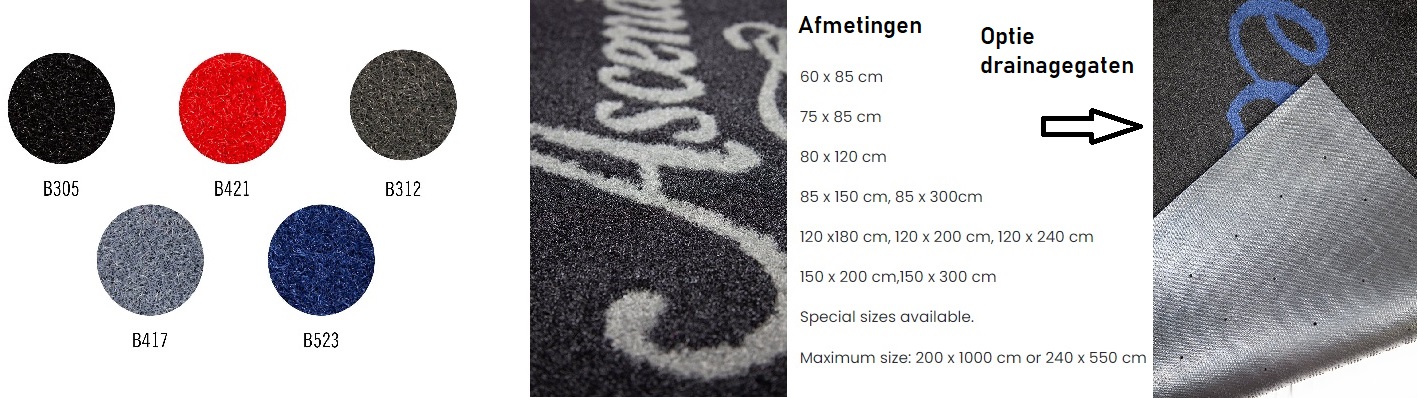 Matten voor buitentoepassingen zijn vervaardigd uit nylon met een rubberen backing van 3,1 mm dik. Indien voorzien van drainage-gaten gelden meerkosten van + 8%. De matten worden vervaardigd met afwerkrand van ca. 1,5 cm. Totaalgewicht is ca. 5,2 kg per m². Totale hoogte is ca.10 mm. In tegenstelling tot bedrukte matten is deze 100% UV resistent en heeft zo een lange levensduur! Personaliseer uw mat naar keuze op de duurzame monovezel in maximaal 1 kleuren. Keuze uit 5 standaard kleuren waaruit dus ook uit 1 van deze kleuren het logo moet bestaan. Afwijkingen in afmetingen tot + of -3%. Verkrijgbaar in een aantal standaardmaten. Naast de standaard maten zijn voor de afwijkende maten prijzen op aanvraag. Printbestand uploaden (minimale hoogte tekst 7 cm en 1 cm dik). Wij kunnen tegen een geringe meerprijs u ook helpen bij de opmaak van het printbestand, neemt u hiervoor contact met ons op. Er worden eenmalige instel- en opstartkosten berekend.| Aantal | Prijs per stuk |