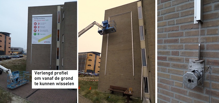 De bannerlift bestaat uit een geanodiseerd aluminium profiel van 4,1 cm met een kederpees uitsparing (van 10 mm) waar de banner met keder in loopt. Rondom nagenoeg winddicht afgesloten waardoor grote afmetingen gerealiseerd kunnen worden omdat de wind er niet achter kan slaan. Banner moet worden voorzien van een kederprofiel, men heeft daardoor geen last van ogen en haken die veel herrie maken als er wind staat. Het hijsmechanisme is goed beschermd tegen stof en regen. Deze uitvoering moet men handmatig omhoog draaien met een afneembare zwengel van hoogwaardig aluminium in een RVS/INOX muurplaathouder. De rollen en hijsmechanische zijn voorzien van kogellagers met offshore kwaliteit en de rollen zijn van hoogwaardig RVS/INOX. De banner wordt aan boven- en onderkant ook voorzien van een keder die in een aluminium profiel getrokken wordt die de boven- en onderaanslag van de banner verzorgen. Het hijsmechanisme is aan de bovenzijde gesloten met een aluminium afdekkap. De wind- en sterkteberekeningen zijn voorhanden. Het systeem is CE gekeurd. Maximale afmeting 9 m breed 9 m hoog. Optioneel zijn verlengingsprofielen indien de banner op grotere hoogte gemonteerd wordt en men de banner vanaf de grond wil wisselen. Zie voor prijsaanvraag bijgaand document. Prijs aanvraag inclusief of exclusief full colour banner. Prijs aanvragenWilt u een prijs aanvragen?